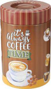 En stilfull och praktisk plåtburk med kaffetema som passar perfekt i köket för förvaring av kaffe, te, kakor eller andra torrvaror. Burken är dekorerad med ett charmigt mönster och texten “It's Always Coffee Time”, tillsammans med motiv av kaffekopp och kaffebönor som ger en klassisk café-känsla.