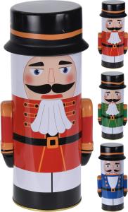 Detaljrik plåtburk med lock i form av en Nötknäppare. Mått: ca 25x8 cm.