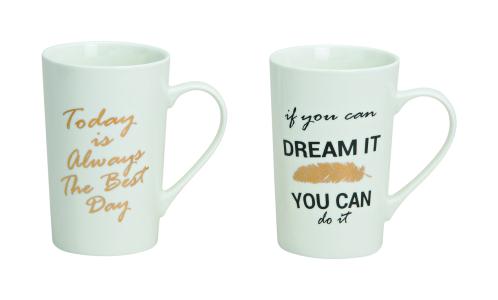 Porslinsmugg med guldtext som finns med två olika texter " Today is always The Best Day" och "if you can DREAM IT YOU CAN do it". Mått: ca 8X12 cm. Endast handdisk, ej micro.
