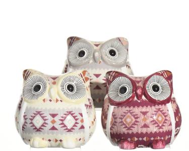 Porslinsuggla med inkamönster som finns i tre olika färgvarianter. Mått: 11X9,5X11cm.