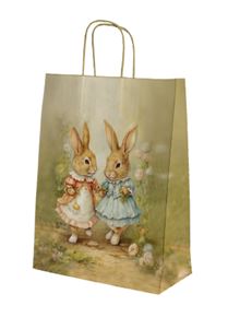 Söt presentpåse i papp med motiv av charmiga harar. Perfekt för små presenter, godis eller påskgåvor.