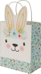 Presentpåse i papp med blommor och kaninmotiv – perfekt för påsk- eller vårpresenter, godis och små gåvor.