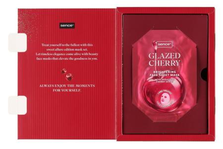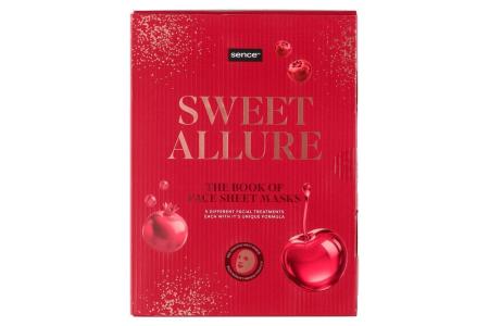 Unna dig själv eller någon du tycker om Sweet Allure – The Book of Face Sheet Masks! Ett lyxigt presentset med fem olika ansiktsmasker som återfuktar, ger lyster och fräschör. Innehåller dofter och ingredienser från körsbär, bär, hallon, granatäpple och jordgubb.