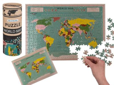 Pussel med världskarta, 300 bitar. Storlek ca 50 × 35 cm. Levereras i papptub.