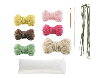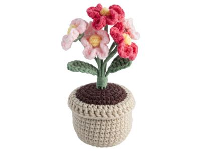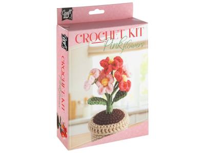 Virkset för att skapa en söt blomma i kruka med rosa blommor. Setet innehåller garn i 100 % polyester, fyllning och virknål.