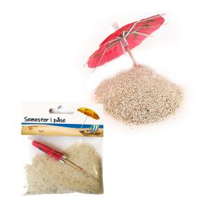 Rolig present till den som längtar efter sommar, sol och semester. Påsen innehåller sand och parasoll i miniformat. Färgen på parasollet varierar, skickas slumpvis. Mått på förpackningen 13x10cm.