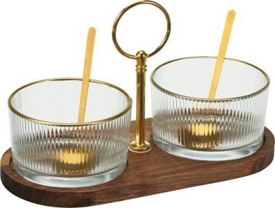 Elegant serveringsset med två räfflade glasskålar, två guldfärgade skedar och en bricka i acaciaträ. Perfekt för snacks, såser eller små efterrätter.