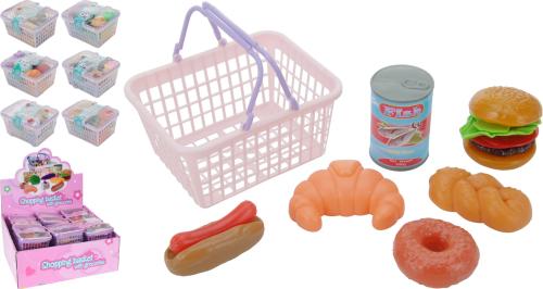 Shoppingkorg med olika varor. Mått på korgen 13X8 cm och mått på varorna ca 5X6 cm. Material: plast. Levereras slumpvis.