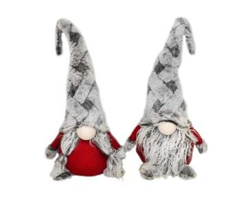Sittande tomte i tyg och lurvig luva.