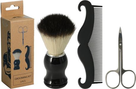 Skägg- och mustaschvårdskit med borste, kam och sax. Perfekt för trimning och styling. Kompakt format – idealisk present eller för resan.