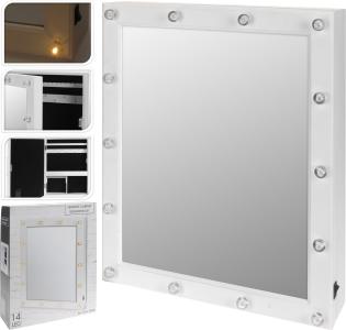 Smyckesskåp med spegel och 14 stycken LED-lampor runt spegeln. Skåpet är 36x 44x 10cm. Belysningen kräver 2xAA 1,5V batterier (INGÅR EJ).