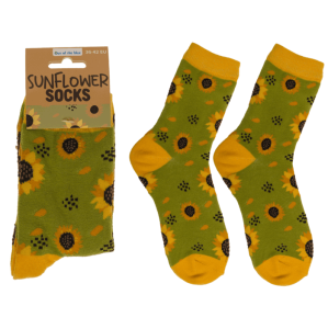Solrosstrumpor med färgglatt mönster av solrosor på grön bakgrund och gula detaljer. Storlek 36–42. Perfekta för sommarkänsla året om!