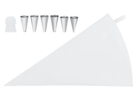 Återanvändbar spritspåse inklusive 6st vanligaste munstyckena och koppling för enkel fastsättning. Används för dekoration, bakning och dosering. Material: rostfritt stål, PP plast, bomull.
