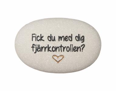 Dekorativ minnessten med texten "Fick du med dig fjärrkontrollen?". En kärleksfull och humoristisk detalj att placera på graven.