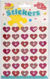 Söta 3D stickers i form av rosa, röda och cerise glittriga hjärtan med en sten i mitten.