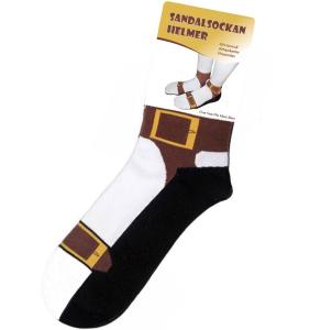 Strumpor med roligt motiv av sandaler. Varför nöja sig med bara strumpor eller bara sandaler? Med Sandalsockan Helmer får du det bästa av två världar. Perfekt som en rolig present till någon som har humorn i behåll.