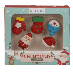 Varje set innehåller fem suddgummin formade som klassiska julikoner – tomteluva, julgran, ren, vante och julstrumpa – i glada färger som sprider julstämning.