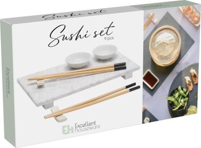 Setet består av en upphöjd serveringsbräda i marmor, två små porslinsskålar, två par ätpinnar i bambu och två matchande hållare för ätpinnar.