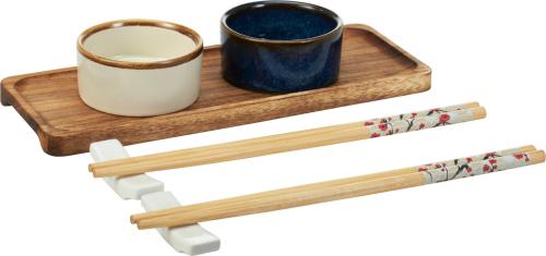 Serveringsset med 2 skålar, 2 par ätpinnar, 2 hållare och en träbricka. Perfekt för aptitretare, sidorätter eller japanska smårätter. Både vackert och funktionellt.