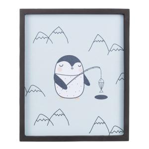 Tavla med träram och motiv av en söt pingvin som fiskar Mått: 25X30 cm. Swedish design Oscar Löfstrand.