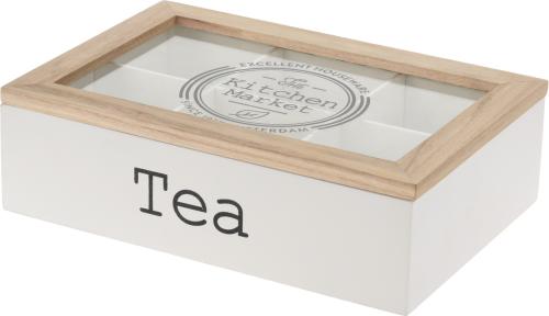 Telåda i trä med 6 stycken fack för olika te-sorter. Mått: 24x16,5x7cm.