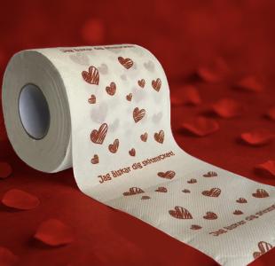 Toalettpapper med röda hjärtan och texten "Jag älskar dig skitmycket!" – en rolig och kärleksfull present som garanterat får mottagaren att le, även i de mest privata stunderna.