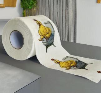 Toalettpapper med tryck av en kyckling som sitter på toaletten – en humoristisk och annorlunda detalj som passar perfekt som påskpresent eller kul dekoration i badrummet.