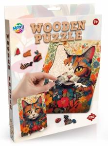 Upptäck ett vackert träpussel med 125 bitar, där varje pusselbit är unikt formad till dekorativa mönster eller djur.