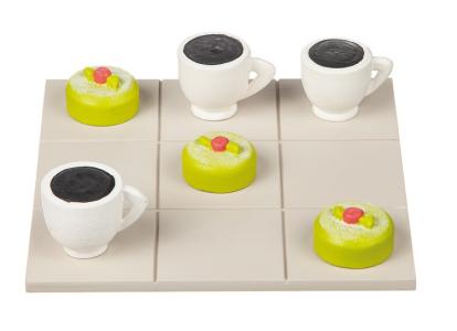 En lekfull version av det klassiska spelet tre i rad med spelpjäser formade som prinsesstårtor och kaffekoppar.