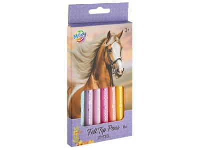 Fint set med 8 pastellfärgade tuschpennor i förpackning med hästmotiv. Perfekt för pyssel och färgläggning.