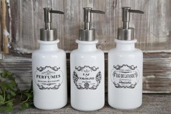Tvålpump i porslin med tre olika texter ; PERFUMES, EAU DE LAVANDE eller EAU DE COLOGNE DE FRANCE. Höjd 20cm.