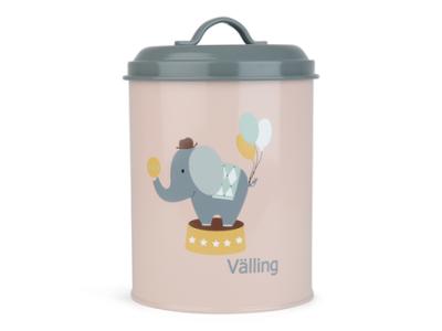 Supersöt vällingburk med djurmotiv. Material: metall, Mått: 13,8X17,5CM. Rymmer 2,2l.