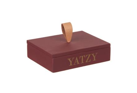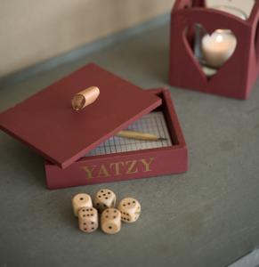 Den röda trälådan med ingraverad text "YATZY" är inte bara en fin inredningsdetalj utan också en smart förvaringslösning.